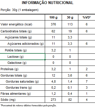 INGREDIENTES: Farinha de arroz, amido de milho, açúcar mascavo, gordura vegetal, castanha de caju, linhaça dourada, sal, canela em pó, farinha de chia, farinha de quinoa, edulcorantes: maltitol e glicosídeos de esteviol, emulsificante lecitina de girassol, aromatizantes, agente de crescimento bicarbonato de sódio e espessante goma xantana.