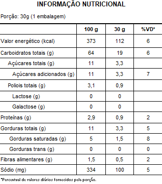 INGREDIENTES: Farinha de arroz, amido de milho, açúcar mascavo, gordura vegetal, coco ralado, linhaça dourada, sal, canela em pó, farinha de chia, farinha de amaranto, farinha de quinoa, edulcorantes: maltitol e glicosídeos de esteviol, emulsificante lecitina de girassol, aromatizantes, agente de crescimento bicarbonato de sódio e espessante goma xantana.