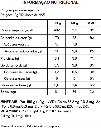 INGREDIENTES: Flocos de milho, açúcar, banana desidratada, linhaça, chia, gergelim,