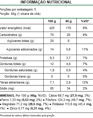 INGREDIENTES: Flocos de milho, açúcar, linhaça, uva passa, castanha -do-Pará, gergelim, quinoa em flocos, óleo de girassol, canela em pó, sal marinho e edulcorante glicosídeos de esteviol